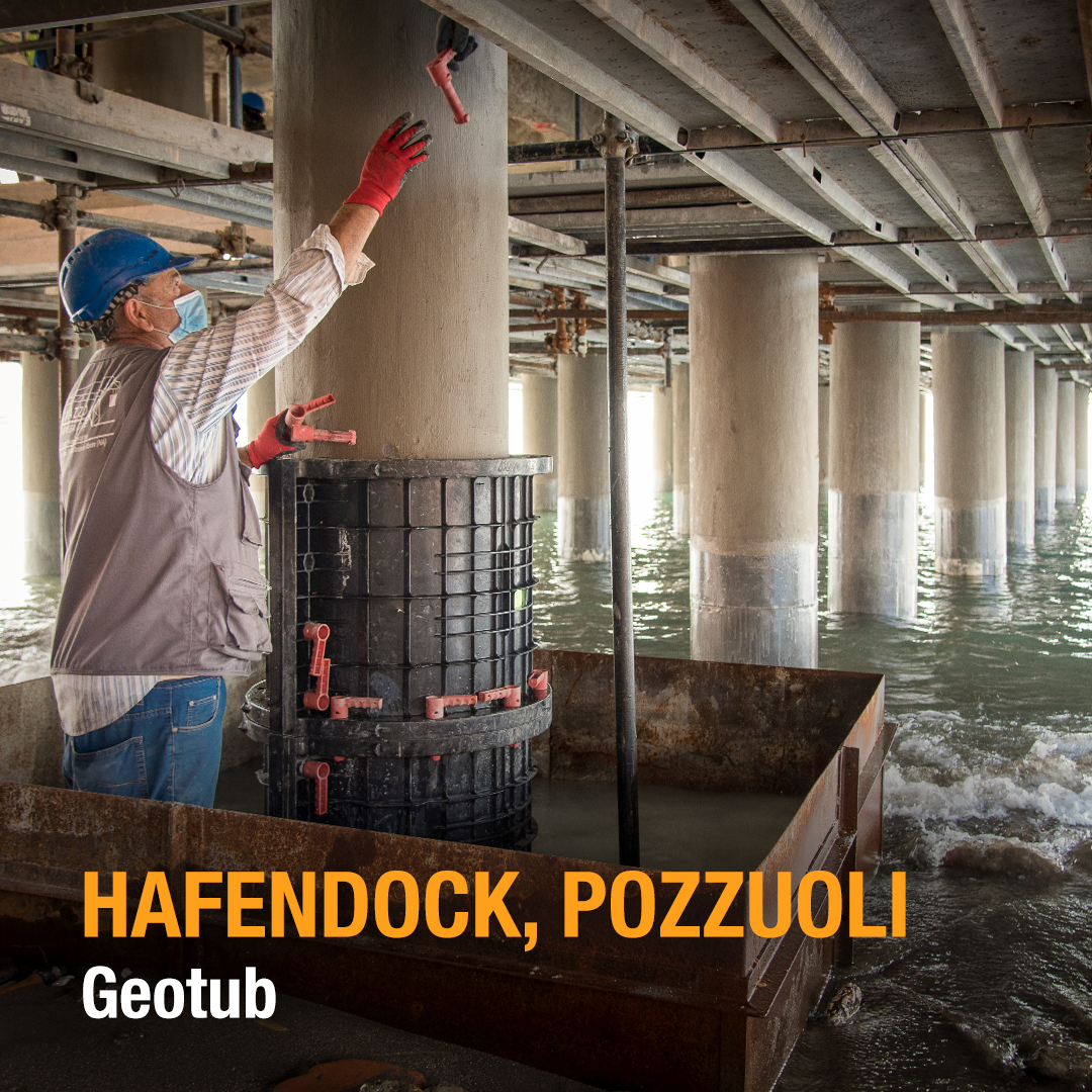 Bei der Reparatur der Säulen des Bootsdocks in Pozzuoli machte Arbeiten unter Wasser erforderlich. Geotub wurde aus wasserfestem Recyclingkunststoff hergestellt und trug dazu bei, die Aufgabe zeitnah zu erledigen, was mit Holz- und Metallschalungen eine Herausforderung gewesen wäre.