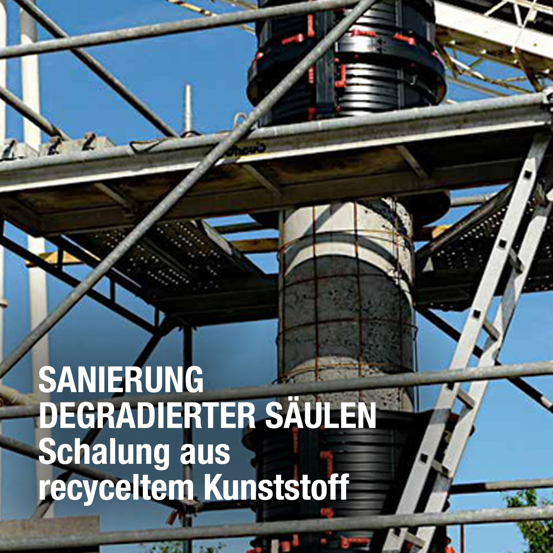 Anders als Schalungen aus Holz, Metall und Pappe ist die Schalung aus recyceltem Kunststoff von Geoplast leicht, witterungsbeständig und ermöglicht eine seitliche Platzierung, was sie für die Sanierung von maroden Säulen unersetzlich macht.