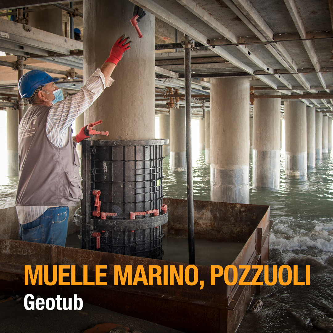 La reparación de la columna del muelle de embarcaciones de Pozzuoli requirió trabajos a realizar bajo el agua. Geotub estaba hecho de plástico reciclado resistente al agua, lo que ayudó a completar la tarea a tiempo, lo que habría sido todo un reto con encofrados de madera y metal.