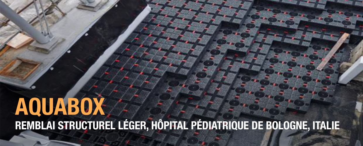 Bien qu’elle soit conçue comme une solution de gestion des eaux pluviales, Aquabox dépasse parfois son objectif initial. Étant donné que ses modules rectangulaires peuvent former des structures stables de différentes formes, Aquabox a été utilisé comme solution de remblai léger, pour remplacer de grands volumes de sol dans le jardin sur le toit de l’hôpital de Bologne.