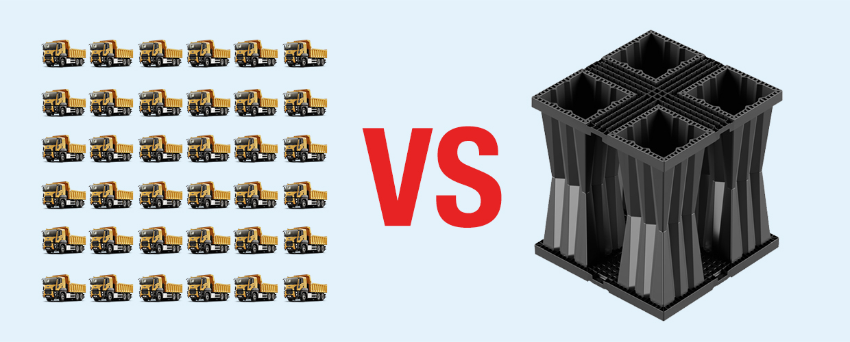 Per costruire un bacino di 450 m3 per la gestione delle acque piovane è necessario solo 1 camion di Aquabox, invece di 75 camion di ghiaia. Grazie al suo materiale e al suo design innovativo, Aquabox offre importanti vantaggi logistici, aumentando notevolmente la redditività e la sostenibilità dei progetti di costruzione.