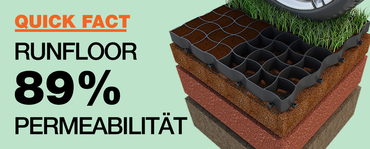 Runfloor ist unsere Lösung für den Hochwasserschutz mit einer Oberflächenpermeabilität von bis zu 89%. Bei Verwendung in hochohmigen Park- und Transitbereichen schützt Runfloor das Gras und ermöglicht eine einfache Pflege der grünen Oberfläche. Grüne Parkplätze bieten natürliche Entwässerung und weisen im Vergleich zu Alternativen die höchste Hochwasserresistenz auf.