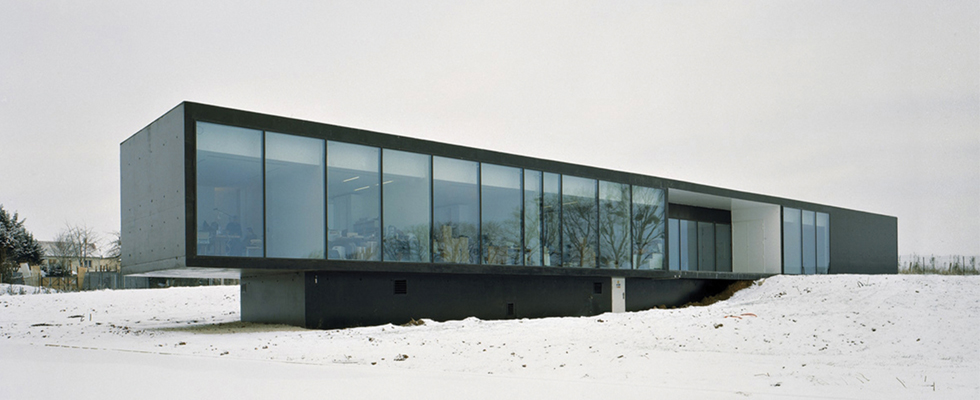 Dieses Gebäude, das an die reinen Formen der frühen Modernisten erinnert, wurde so entworfen, dass es in Bezug auf Licht und Farbe von der umgebenden Landschaft profitiert und diese im Gegenzug respektiert. Es ist in zwei Bereiche unterteilt: die Werkstatt im Erdgeschoss und die Büros im oberen Bereich. Unser Drening wurde eingesetzt, um das minimalinvasive Regenwasserabflusssystem zu bauen, das eine sehr geringe Aushubtiefe ermöglicht und gleichzeitig die Wiederverwendung des Regenwassers erleichtert.