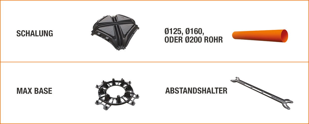 - Einem Bodengitter, das aus Max-Basissockeln und Abstandshaltern besteht.
