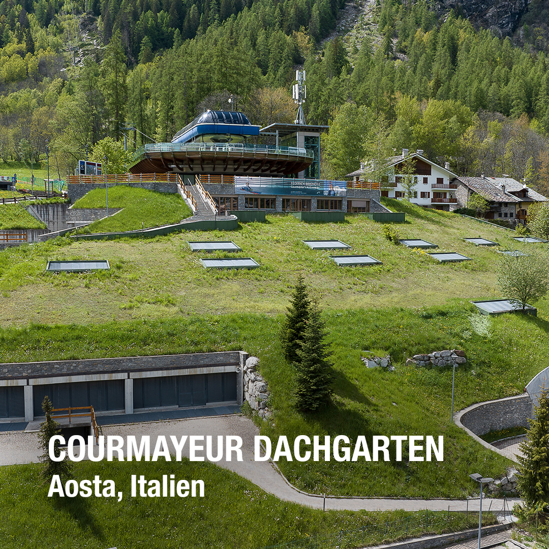 Parkplätze bestehen oft aus großen, flachen Betonflächen, die im Sommer viel Wärme speichern, was sich negativ auf die natürliche Umgebung auswirkt. Drainroof hat ein schräges Gründach über dem Seilbahnparkplatz in Aosta angelegt, das Temperaturschwankungen reduziert und die optische Attraktivität des Geländes aufwertet.