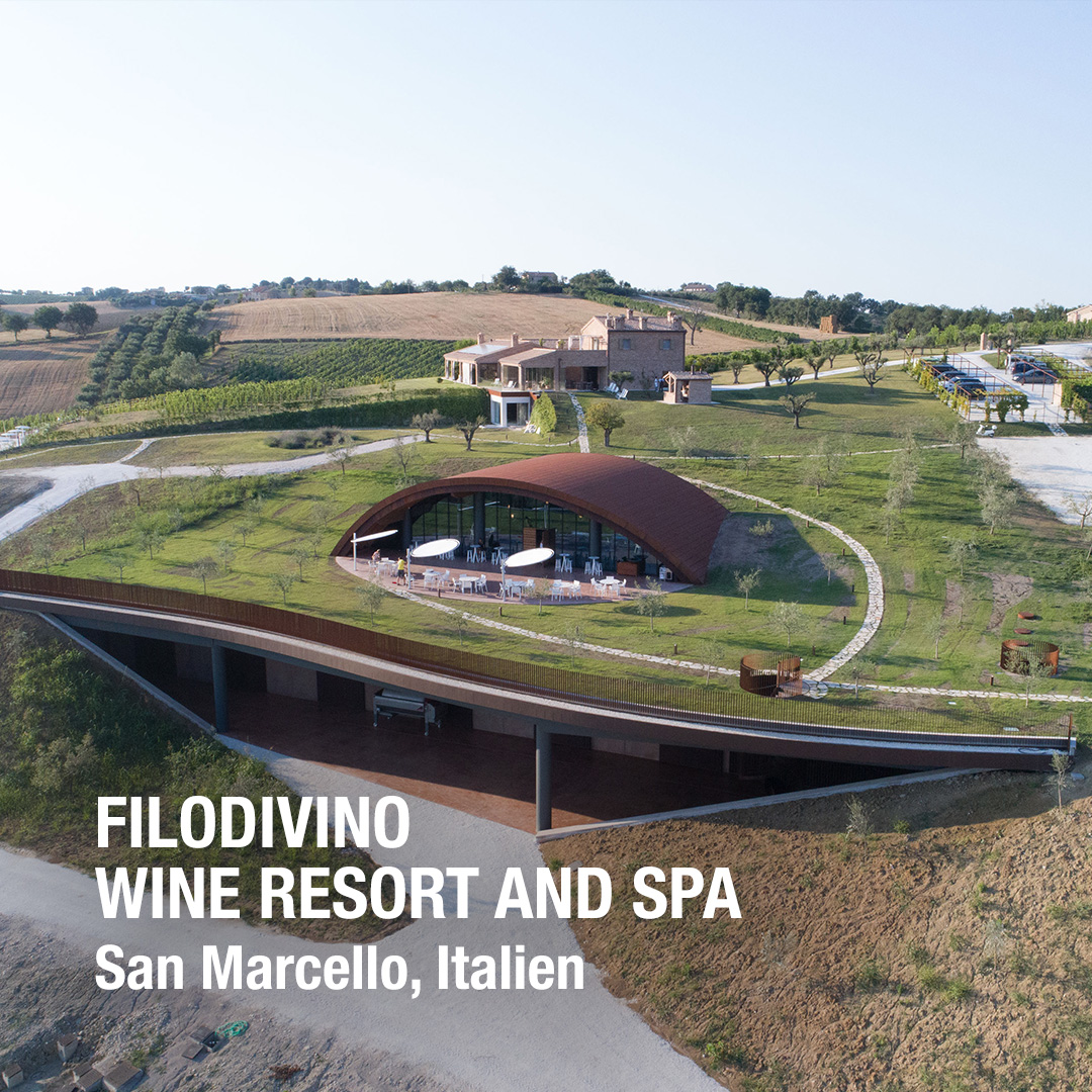 Das von der Architektin Cristiana dell’Acqua vom Studio dell’Acqua entworfene Filodivino wurde in das Gelände integriert, wobei das Dach die größte den Temperaturschwankungen ausgesetzte Fläche ist. Drainroof verstärkte die Gebäudeisolierung, verbesserte die Energieeffizienz und fügte sich harmonisch in die Hügellandschaft der Region Marche ein.
