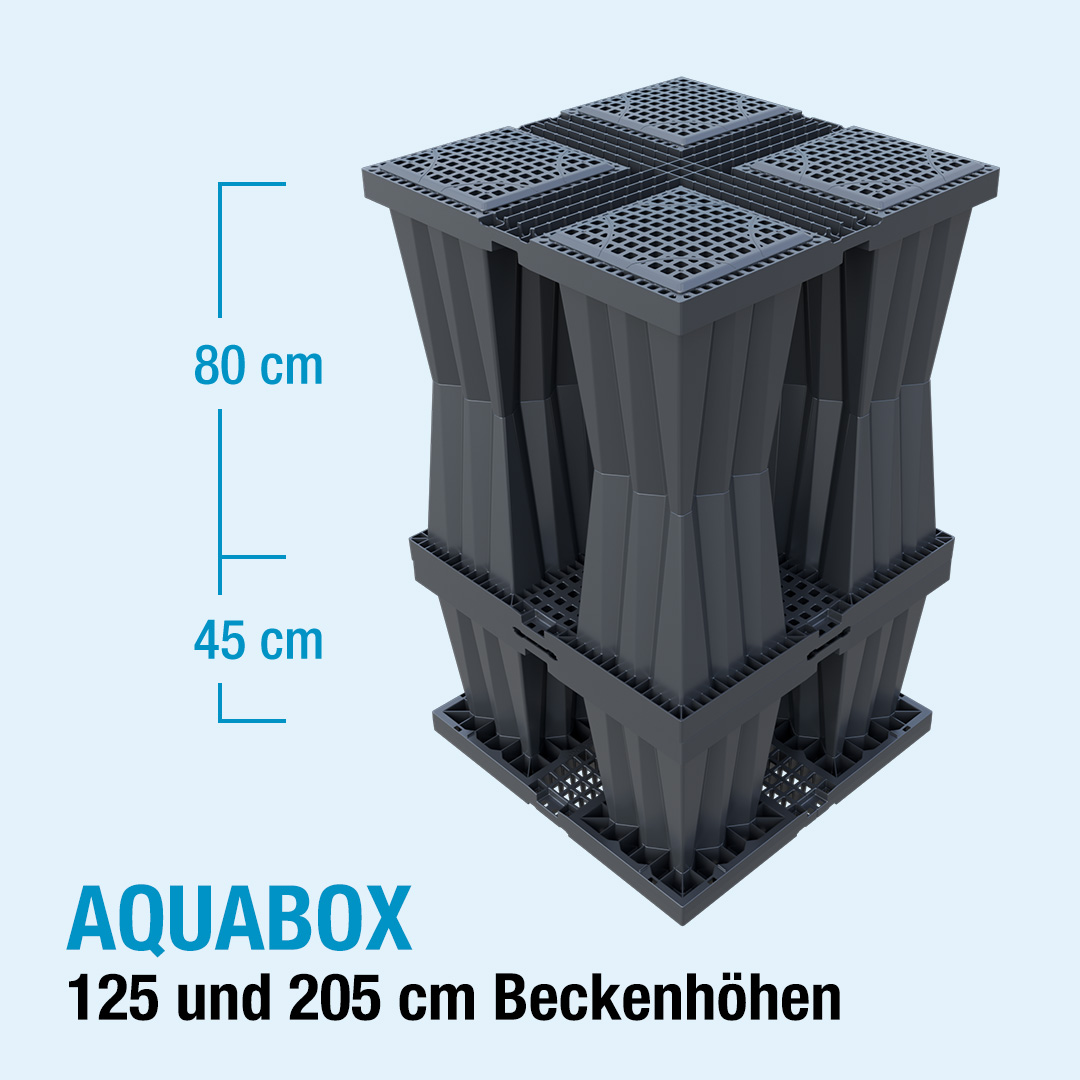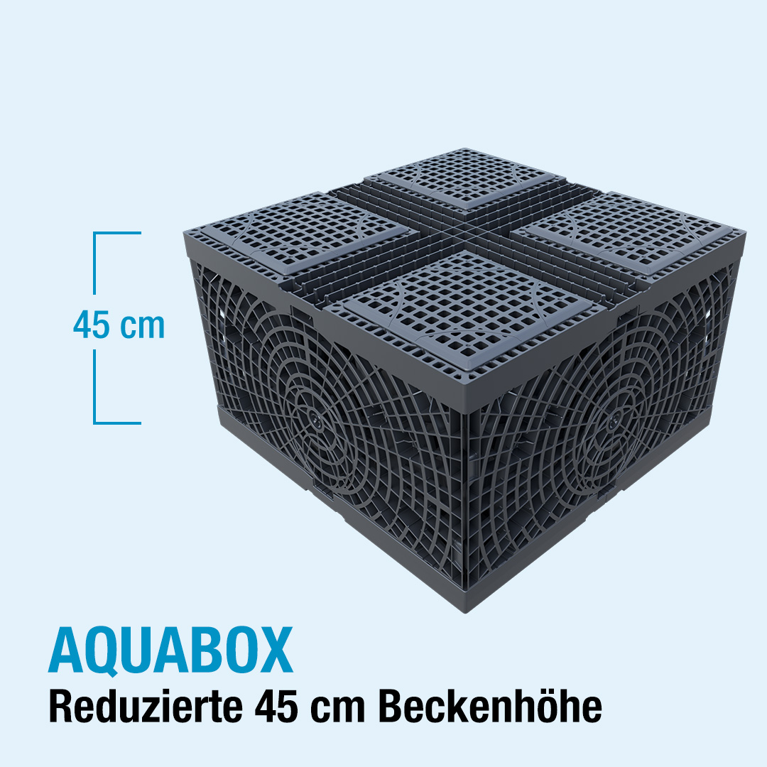 Die Aquabox Half Base bietet eine solide 5 cm starke Basis für Aquabox-Module. Dieser Zusatz ermöglicht eine reduzierte Höhenkonfiguration von 45 cm, perfekt für kompakte Räume oder präzise Aushubanforderungen.