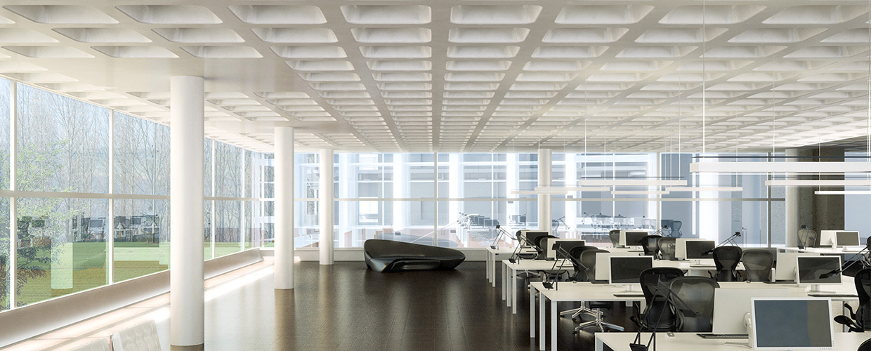 Skydome Module sind so geformt, dass sie eine Decke mit Waffeleffekt bilden, die für ein ästhetisch ansprechendes, modernes Interieur offengelassen werden kann.