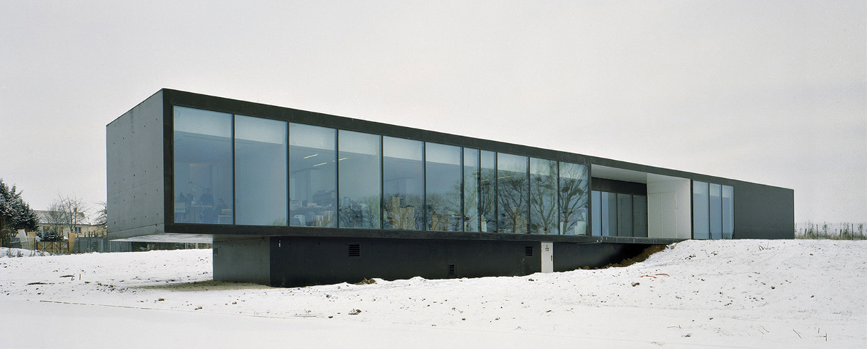 Dieses kleine Bürogebäude, das förmlich in den Boden eingebettet ist, befinden sich 1.000 m2 große unterirdische Becken. Die Becken sind zum Sammeln und Ablassen von Regenwasser und ermöglichen dessen Wiederverwendung. Drening erfordert einen Aushub mit geringer Tiefe, ist für die Installation auf engstem Raum geeignet und verhindert Überschwemmungen.