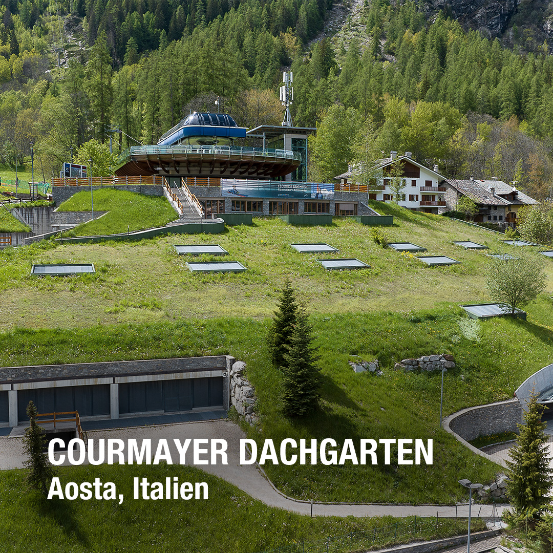 Bei dem Projekt in Courmayeur ging es darum, das 2.000 m² große Parkhaus in die natürliche Umgebung zu integrieren. Drainroof wurde auf einem 15 % steilen Hang installiert und stützt 800 m³ Boden mit Rasen und mittelgroßen Sträuchern, die sich nahtlos in die Alpenlandschaft einfügen und die natürliche Regenwasserdurchlässigkeit des Gebiets erhalten.