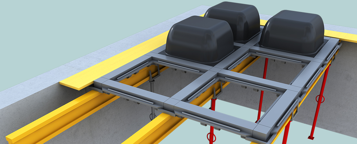 Die kuppelförmigen Formen erzeugen eine Matrix von Hohlräumen, die von orthogonalen Rippen umgeben ist, wodurch eine Zweiwegkonfiguration erzeugt wird, die sehr gut für großspannende Decken geeignet ist.