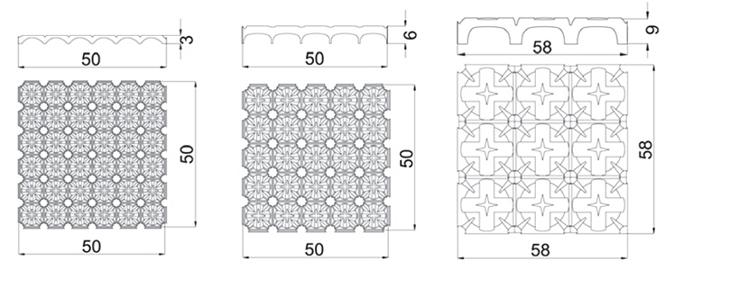 | Größe (cm) | 50 x 50 x h3 cm | 50 x 50 x h6 cm | 58 x 58 x h9 cm | |