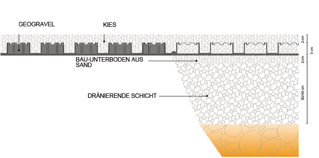 Die Nachteile, die häufig in den mit Kies bedeckten Flächen auftreten, sind die Bildung von Furchen und Pfützen, die Staubbildung sowie die Schwierigkeit diese mit Rollstühlen, Fahrrädern, …… zu befahren. Kontinuierliche Wartung ist daher notwendig, um diese Probleme teilweise zu überwinden. Geogravel ist ein Produkt, das speziell für die Entwässerung von Kiesflächen entwickelt wurde. Es ermöglicht die Stabilisierung des Kieses sowohl horizontal als auch vertikal und vermeidet dabei gleichzeitig den Schwund des Kieses der ohne Gitter regelmäßig nachgefüllt werden muss.