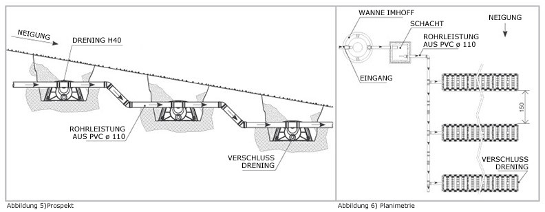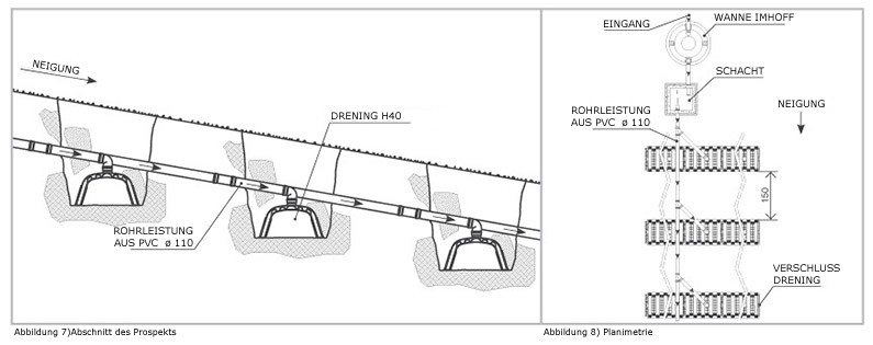 Die Einschitte sind in Serpentinen mit dem Rohr verbunden, das auf den Verschlussen des Vor-und Nachlauf DRENING Reihen gelegt ist.