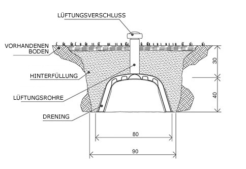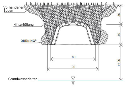 Beurteilung der geologischen Auskünfte des Bodens: wenn der Boden nachgeibig oder wenig dräniert ist, soll man das Bett des Eischitts mit Kies (Korngröße von 20-40 mm und 10 cm hoch) füllen;