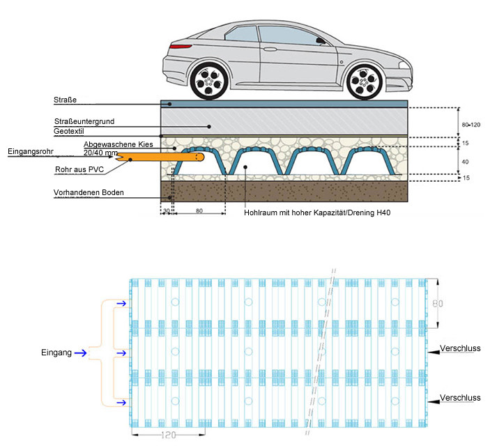 Dieses System kann auch für die Abwasserentsorgung in Siedlungen verwendet werden, die nicht an die Kanalisation angeschlossen sind. Diese Lösung ist ideal für die Regelung des Regenwassers auf Parkplätzen, da sie das Wasservolumen im Entwässerungssystem erheblich reduziert.