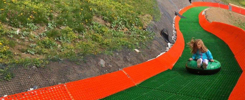 Die 130 Meter lange Bahn ermöglicht den Einsatz von Schläuchen sowohl für Erwachsene als auch für Kinder. Geoski ist ideal, weil es die gleiche Gleitwirkung des Schnees ermöglicht und die Hänge dieses schönen Tales auch im Sommer nutzt.