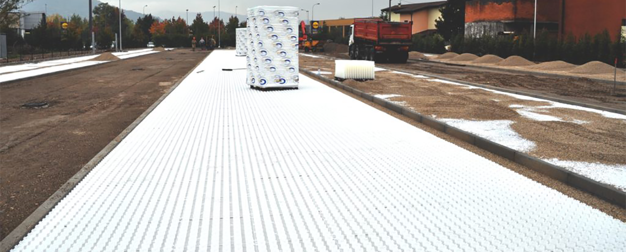 2200 m² of Geogravel have been employed for realizing F.I.S.’s gravel car park. The leveling layer was made with sand mixed with gravel to prevent slippage of the grids. The final result was a permeable car park that guarantees a high comfort and keeps the draining capacity of the soil unaltered.