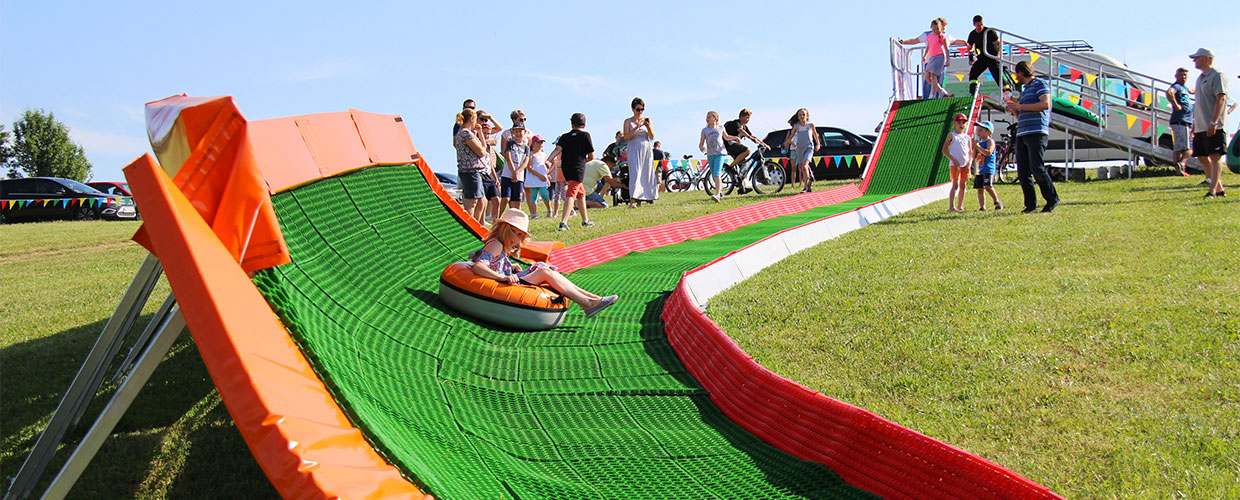 For this aim were used 230 sqm of Geoski, which were laid easily and quickly on the selected area, making the track available for use only a few days after installation. The descent is also provided with three parabolic curves, a ski-lift for easier ascent and an elevated area dedicated to the start of the tubings. Geoski is resistant to all weather condition (UV-rays, rain, snow, ice), offers an optimal glide, thanks to the special product’s conformation and guarantees a safe descent, thanks to the raised edges along the entire trail.