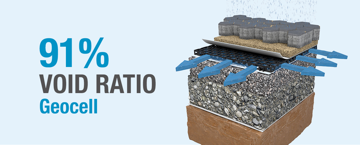 Geocell’s 91% void space effectively manages stormwater runoff beneath paved or landscaped surfaces. This eases pressure on drainage systems and reduces the risk of overload during heavy rainfall.