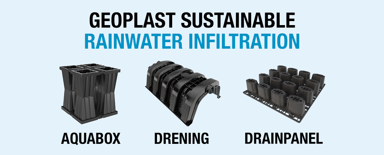 Aquabox, Drening, and Drainpanel are sustainable rainwater infiltration products designed to mitigate rising flood risks in urban areas. Made from recycled plastic modules that create underground infiltration systems of any size, they easily adapt to any location, offering a flexible and sustainably profitable alternative to infiltration ponds, shafts, or concrete tanks.