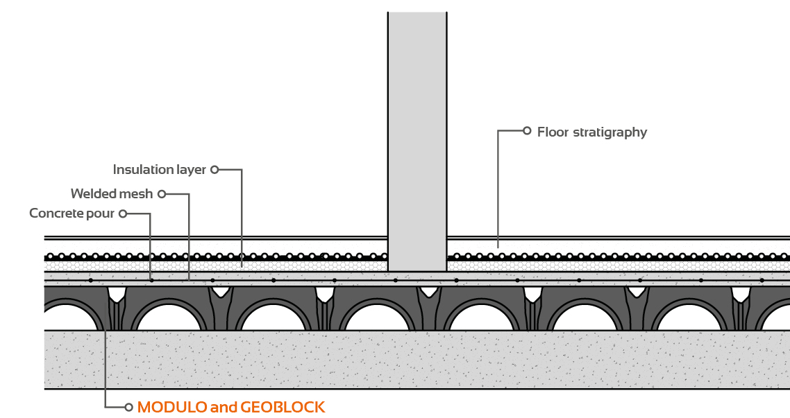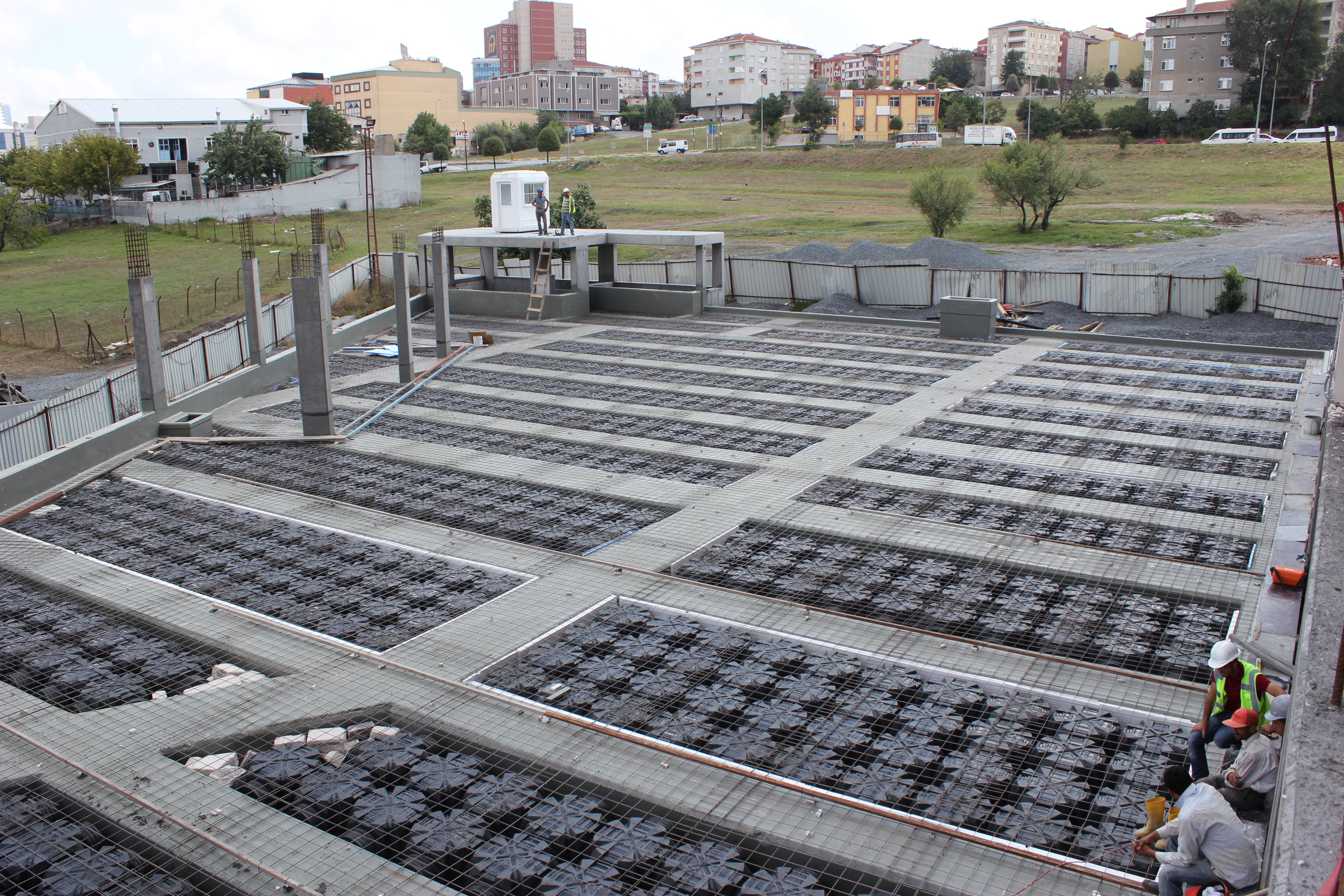 Not only foundations, but also upper floors! With MODULO system we have erected an administration building in Hadimkoy, Istanbul, creating a void space under the flooring, thus lightening the mass of the interstorey slabs and improving the seismic behavior of the whole structure. In fact this formwork in polypropylene combine a lighter weight in comparison with the traditionally used inert material with a higher load-bearing capacity. Moreover, it can be installed faster (up to 100 m² / worker / hour), without the need of lifting devices: the ideal solution to obtain a lightening of the upper floors of the building without using materials which can be difficult to handle on site.