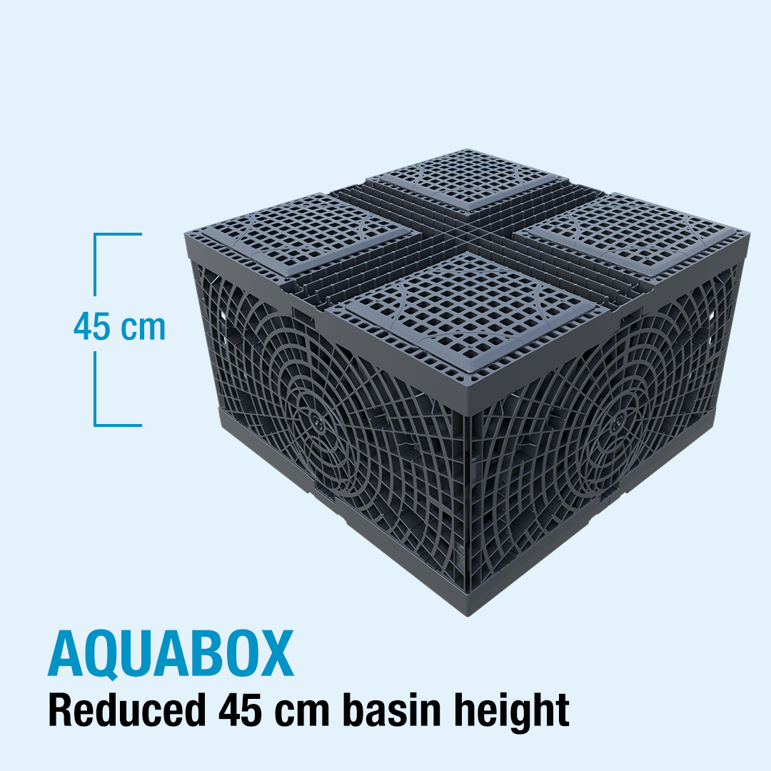 The Aquabox Half Base provides a solid 5 cm foundation for Aquabox modules. This addition allows for the reduced height configuration of 45 cm, perfect for compact spaces or precise excavation requirements.