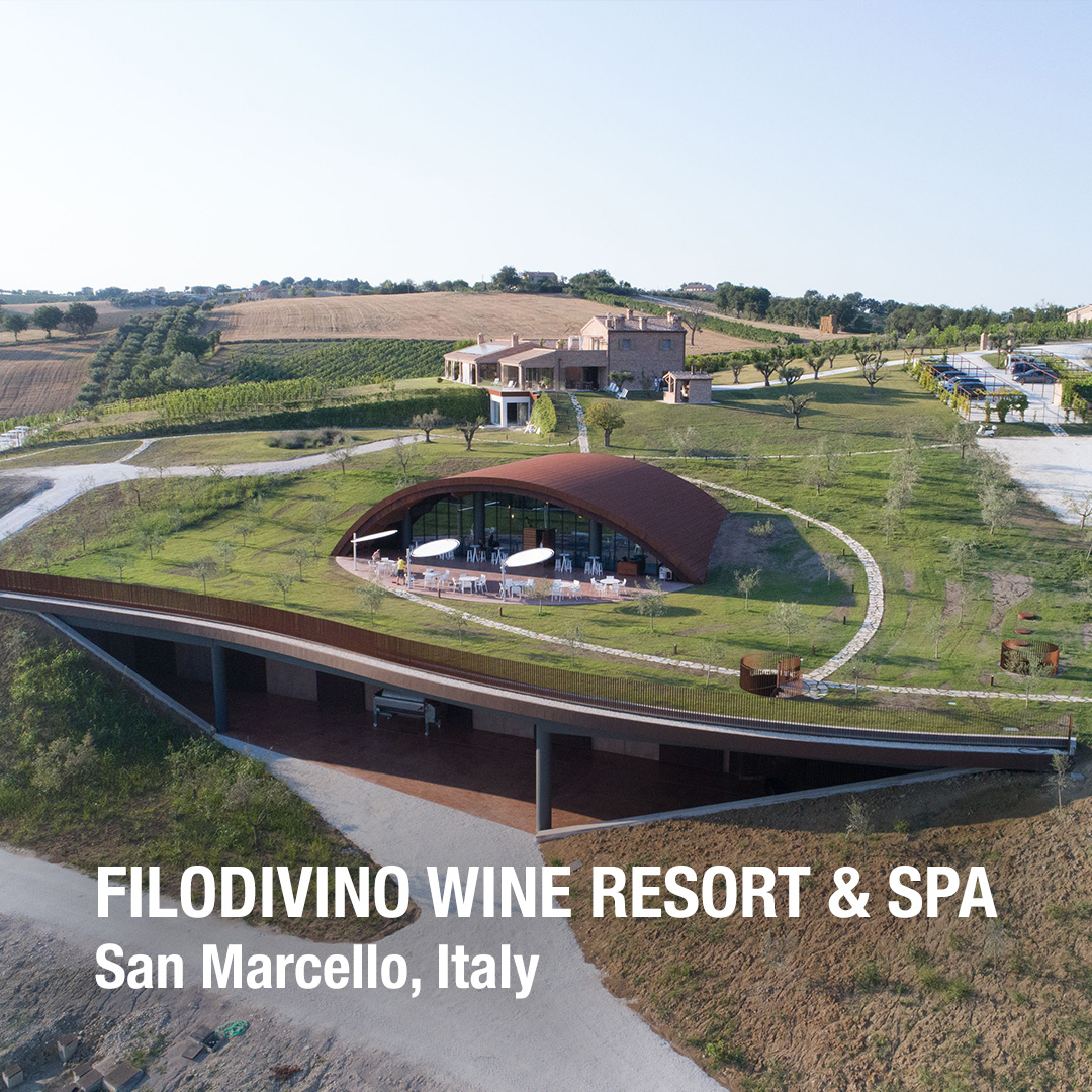 Designed by architect Cristiana dell’Acqua from Studio dell’Acqua, Filodivino Resort was built into the hills of the Marche region. The underground location provided excellent insulation from the sides, but the roof remained exposed to temperature changes. Drainroof was used to create a rooftop garden, integrating the building into the landscape and enhancing its energy efficiency.