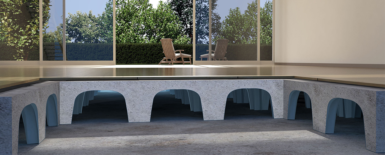 Modulo is a permanent formwork designed for the construction of ventilated crawl spaces and sanitary voids, creating a physical barrier between the ground and the building. Through natural or forced ventilation, the crawl space built with Modulo eliminates rising damp and directs Radon gas toward the atmosphere, enhancing indoor health and improving the durability of the structure.
