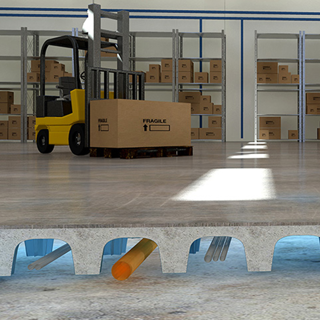 Particularly suitable for industrial buildings, MULTIMODULO also guarantees a fast installation and the creation of a technical void space or a ventilated crawl space. It is ideal for construction of large buildings such as industries or schools.
