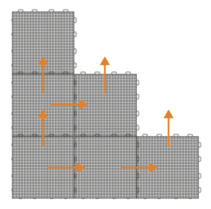 Gripper installation: The tiles are laid using a quick snap-fit coupling. The direction of installation is from bottom to top and from left to right, keeping the hooks up and to the right. For faster installation, the sheets of 4 x 3 tiles can be hooked directly (always following the direction of installation), which are supplied already hooked and stacked on pallets. In the event of outdoor installation, an expansion joint must be left near the curbs and any other object that could hinder thermal expansion. The expansion space depends on the size of the playing field, but at least 5/10 cm is recommended.