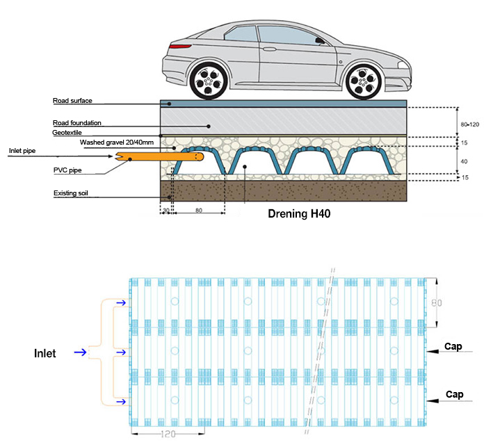 Drening can be installed below any surface: from green areas to heavy traffic zones, provided it is set up with the correct stratigraphy. Installation below buildings is not recommended.