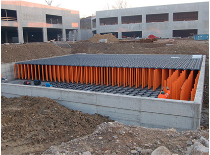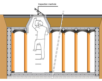 The reinforced concrete structure that can be obtained with NEW ELEVETOR TANK consists of a slab, perimetral walls and a floor supported by pilars.This guarantees an high resitance to overloads, both continuous and live. The NEW ELEVETOR tank’s slab can be dig in in the case of the realization of a green area over the surface or it can be directly loaded for the vehicles transit.