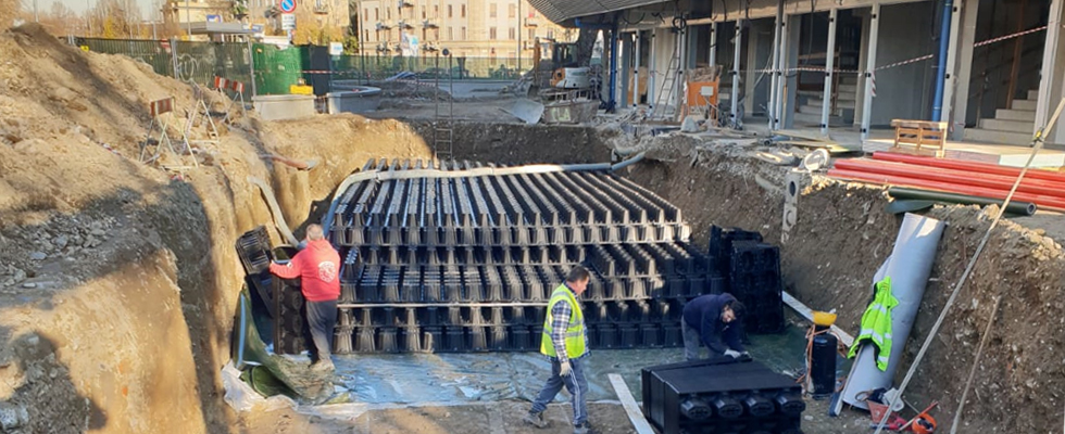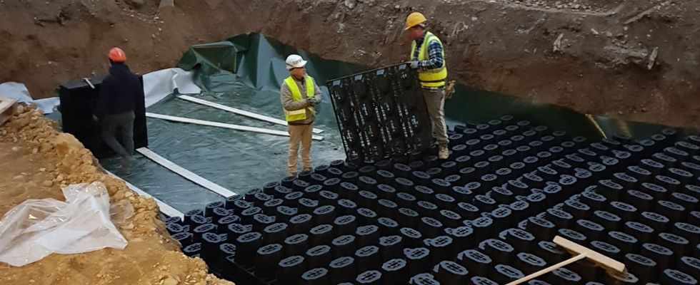 Laminated Drainpanel modules were overlaid with geomembrane. This way accumulation of water is provided and the flow into the subsoil is prevented. This solution provides water management on the site but also improves flooding resilience of the surrounding area.