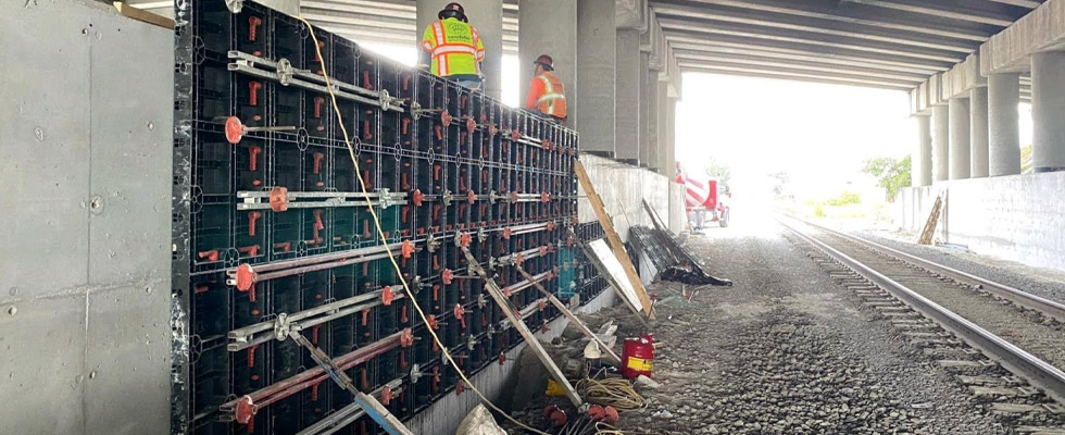 Construction of the protective wall along the Palmetto Expressway required to implement the new concrete wall to existing road infrastructure. Our Geopanel formwork was suitable for the creation of reinforced concrete wall that incorporated pillars of the overpass located near a railway. Given the impossibility to use the crane, Geopanel formwork proved to be the most cost-efficient and time-saving solution.