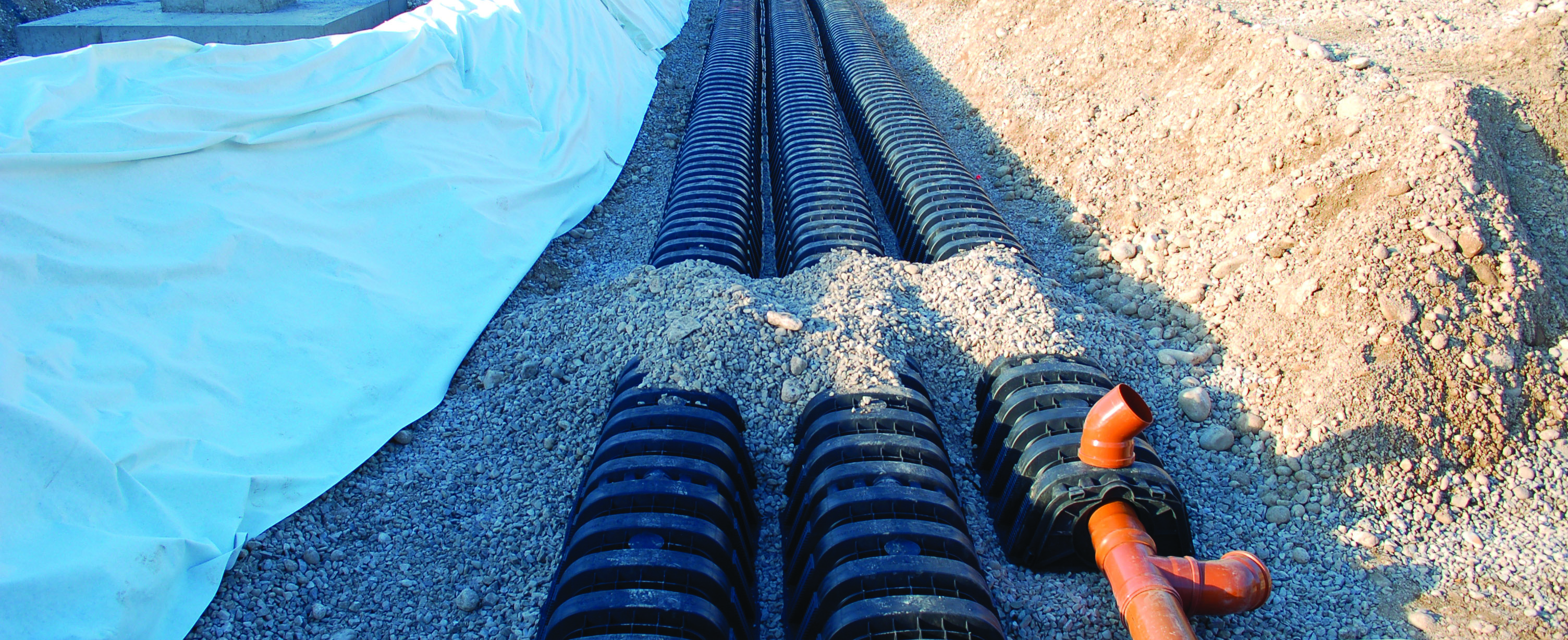 Drening, our plastic tunnel for rainwater infiltration and attenuation, was installed in long lines with intermediate inspection manholes. This allowed to drastically reduce installation time while improving drainage capacity.