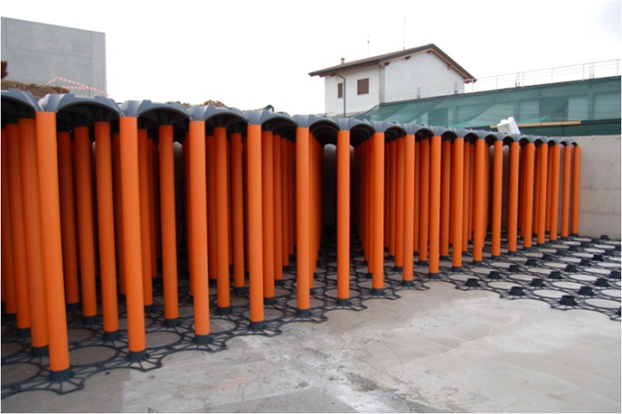 Grids are positioned on the ground and are necessary to support the PVC pipes in a perfect vertical position. The PVC pipes have a diameter of 12,5 cm and variable height, depending on the construction needs (from 75 to 200 cm). They are filled with concrete: in this way they create a supporting structure.