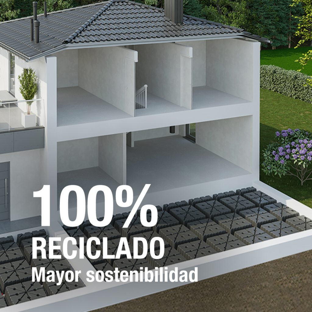 Geopod se fabrica con polipropileno 100% reciclado, reduciendo la dependencia de las materias primas vírgenes y mitigando el impacto medioambiental de la industria de la construcción.