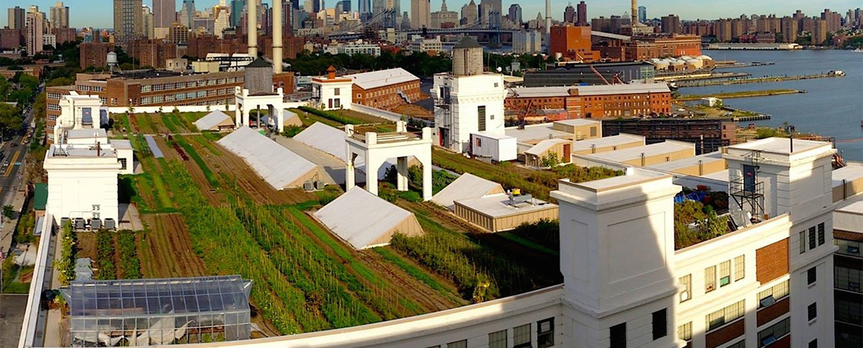 La Brooklyn Grange opera las granjas de tierra más grandes del mundo, que producen más de 50,000 libras de vegetales cada año. Además de aumentar el suministro local de alimentos de la ciudad de Nueva York, la granja también absorbe más de 1 millón de galones de agua pluvial cada año, reduciendo la carga que los sistemas de la ciudad deben administrar.