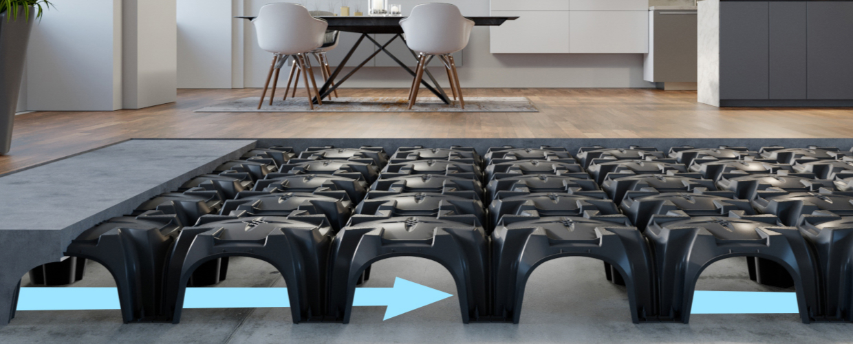 El sistema de encofrado permanente de Modulo crea vacíos estructurales en cimentaciones y losas, reemplazando el hormigón no estructural mientras se mantiene la capacidad portante. Dependiendo del diseño y la aplicación, este enfoque reduce el consumo de hormigón en las cimentaciones hasta en un 20 % o más.