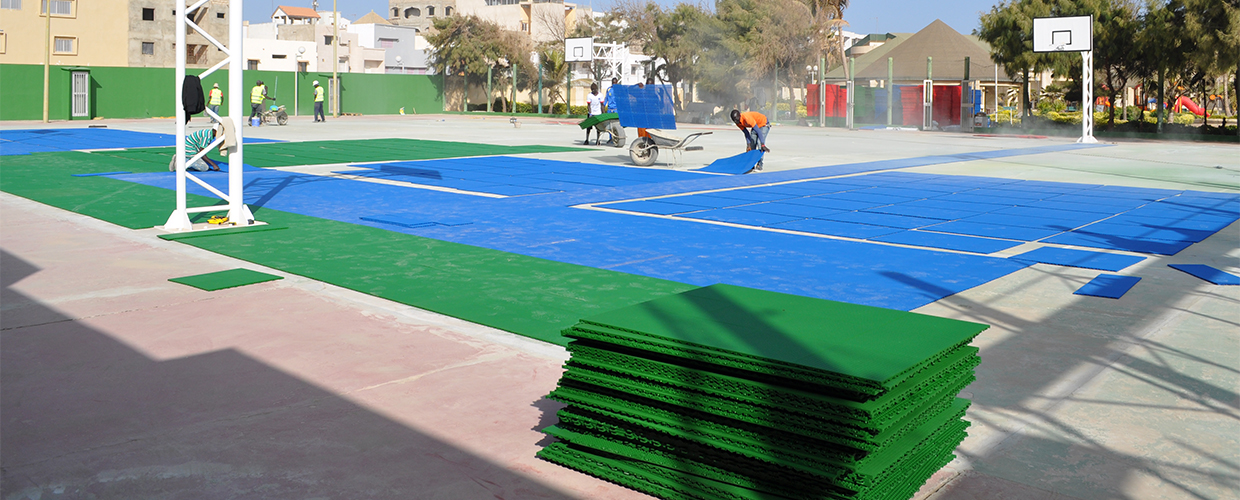Gripper Outdoor es la superficie Geoplast para crear canchas polideportivas. Aquí estamos en Dakar, Senegal, y la empresa Alima Sarl eligió nuestros pavimentos modulares para crear 5 nuevos campos deportivos en el Centre aéré de la BCEAO.