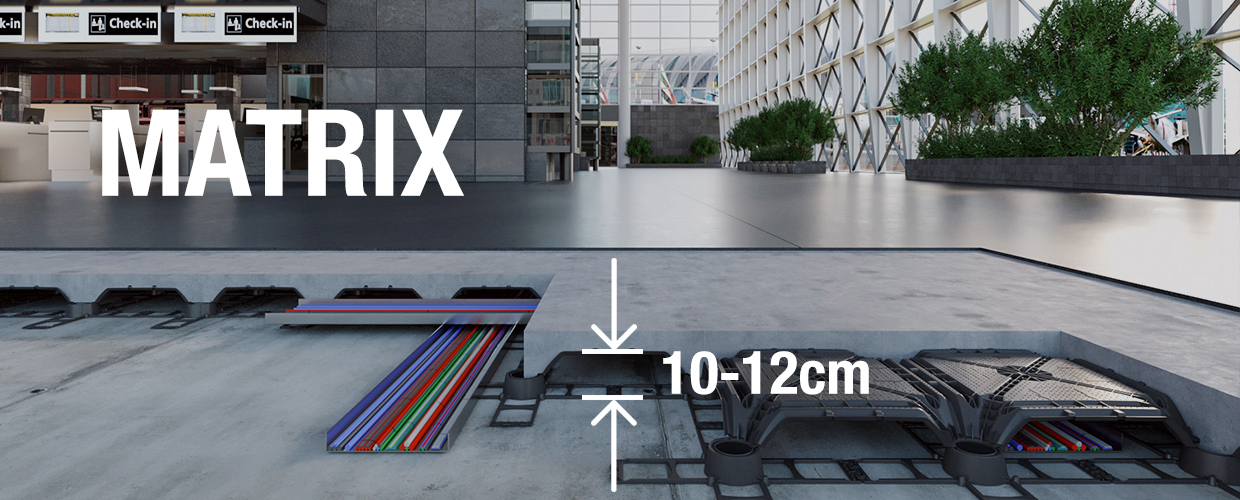 Matrix va un paso más allá, creando suelos elevados de hormigón de 10 a 12 cm de altura. A diferencia de las alternativas de metal para el suelo, Matrix proporciona una configuración intuitiva del sistema MEP, una alta capacidad de carga y una mejor acústica y protección contra incendios.