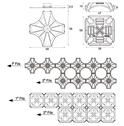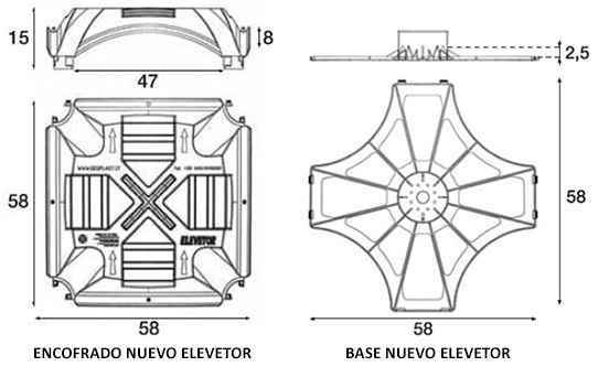 NUEVO ELEVETOR es un sistema innovador de tamaño 58×58 h15 cm para la realización de un tanque de recogida que permite la reducción substancial del consumo de hormigón y de los tiempos de colocación. Los consumos son de 0,030 m/m a ras, mientras que la cantidad de hormigón necesaria para llenar los pilares es de 0,037 m/m por metro linear de altura.