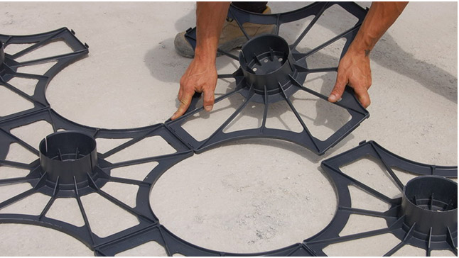 Base NUEVO ELEVETOR, elemento en polipropileno regenerado, garantiza una colocación simple y rápida de los tubos de PVC que soportan el sistema NUEVO ELEVETOR manteniéndolo perfectamente verticales.