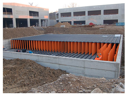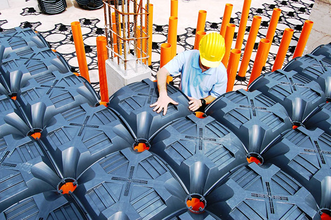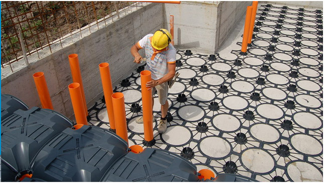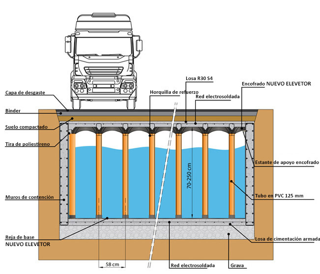 Colocación en la obra del sistema NUEVO ELEVETOR TANK, constituido por los encofrados modulares NUEVO ELEVETOR en polipropileno, de tamaño 58X58 H15 cm, enganchados a tubos Ø 125 mm en PVC de altura variable según las necesidades del proyecto colocados en la base NUEVO ELEVETOR;