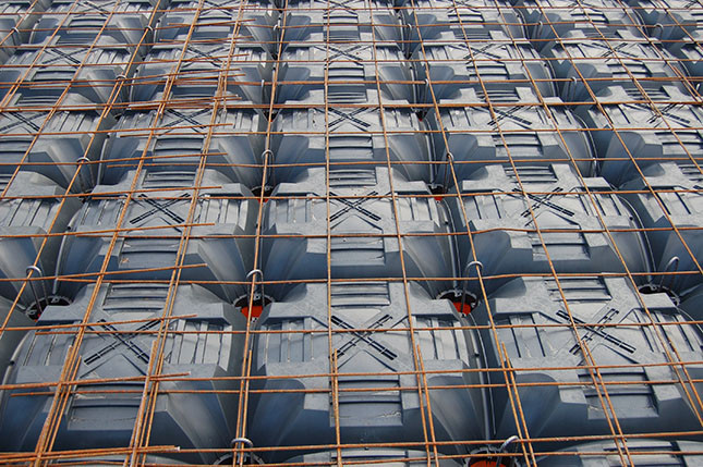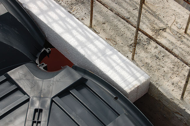 En las paredes, donde los encofrados NUEVO ELEVETOR se apoyan al muro de contención, los listones de poliestireno garantizan que el hormigón no se dispierda.