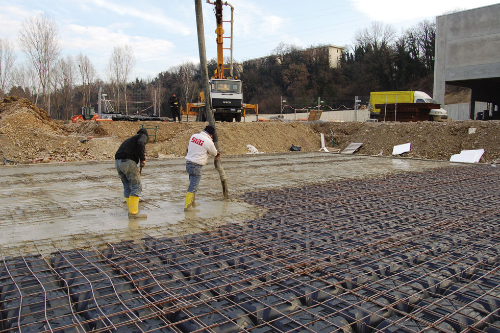 Hormigonado del forjado con hormigón RcK 300 Kg/cm² para llenar los tubos y cubrir los casetones, hasta alcanzar el espesor deseado. En esta fase se deben predisponer eventuales agujeros para los pozos de registro.