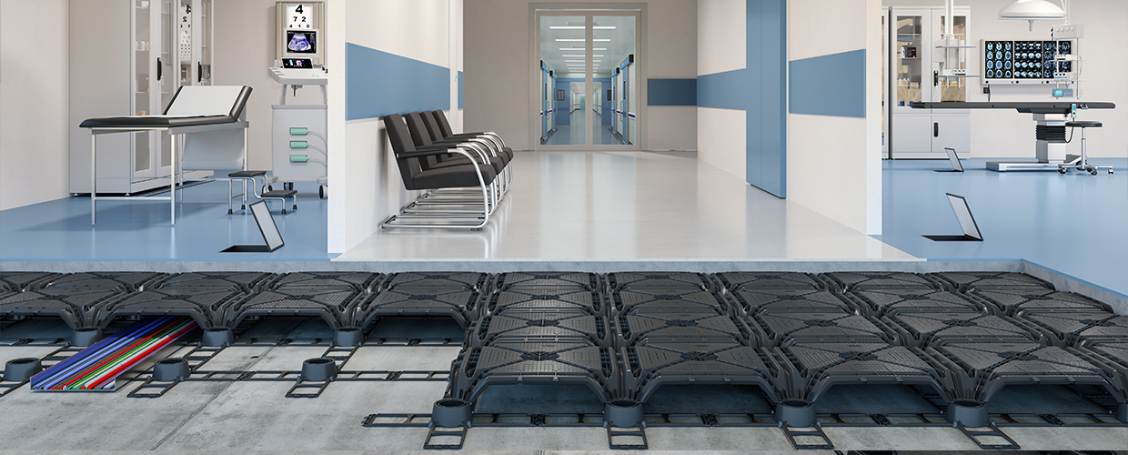 Matrix proporciona acceso máximo a los sistemas MEP. Con tan solo 15 cm de altura total, Matrix crea el paso para las instalaciones de 10–12 cm de altura y 30–40 de ancho.