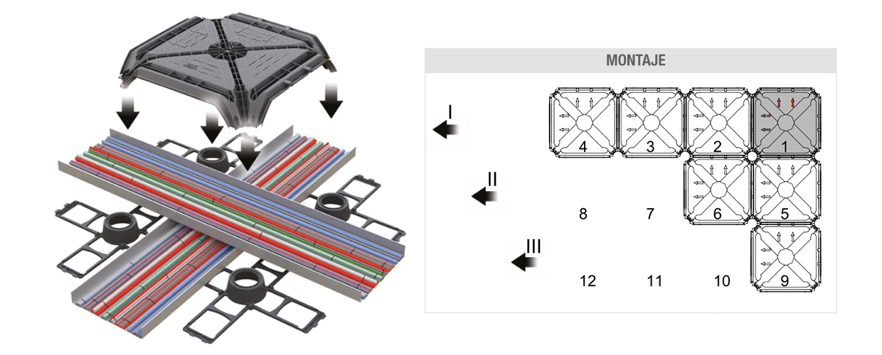 Los módulos de Matrix con base de rejilla de cuatro extremos se colocan sobre la losa y se acoplan mediante enganches a presión. Con esto se hace un plano para el paso de los sistemas MEP.