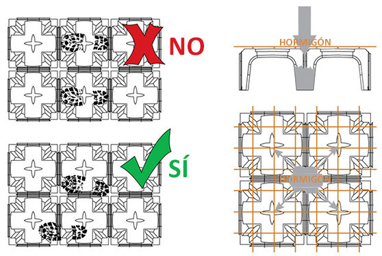 Se debe siempre realizar el hormigonado sólo después de haber colocado el mallazo y de habernos asegurado de la correcta colocación de los casetones. En días calientes, con temperaturas próximas a los 30° C, se aconseja realizar el hormigonado en las horas más frescas del día y si no fuera posible, remojar los casetones. Para MODULO 71×71 se aconseja esperar por lo menos 1 hora antes de rellenar completamente la fundación.